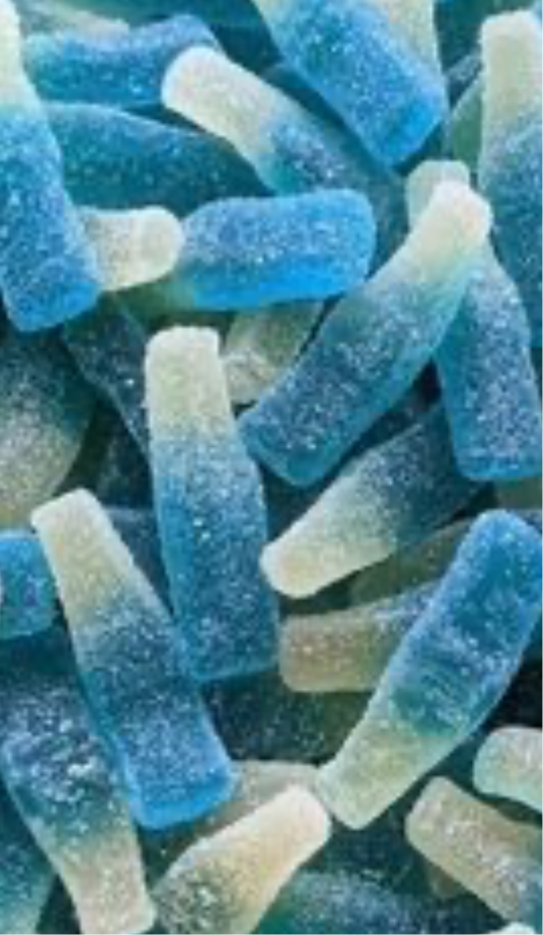 Ingrédients : Sirop de glucose, sucre, eau, gélatine de boeuf, amidon modifié de pomme de terre, acidifiants : E330, E270, agent d'enrobage : cire de carnauba, arôme, colorants : E133. SANS GLUTEN