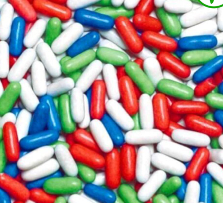 Ingrédients : Sucre, sirop de sucre mélassé, farine de blé, amidon, extrait de réglisse, maltodextrine, arômes, colorants (curcumine, carmins, bleu patenté V, carotènes mélangés), sel, émulsifiant : mono- et di-glycérides d'acides gras, correcteur d'acidité : carbonate acide de sodium, agents d'enrobage (cire d'abeille, cire de carnauba).