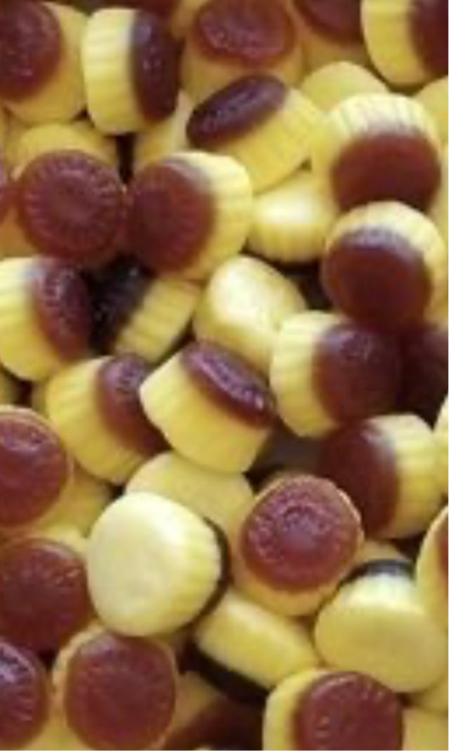 Ingrédients : sirop de glucose, sucre, eau, gélatine de boeuf, amidon modifié de pomme de terre, acidifiants : E270,E330, arômes, agent d'enrobage : huile végétale (palme), E901,E903, arômes, colorants : E150c, E100. SANS GLUTEN , HALLAL