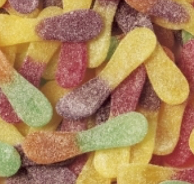 Ingrédients : Sucre, sirop de glucose, amidon modifié (dont blé), acidifiants (acide lactique, acide malique), gélatine, arômes, graisse végétale hydrogénée, colorants : E100, E140, E160c, E163.